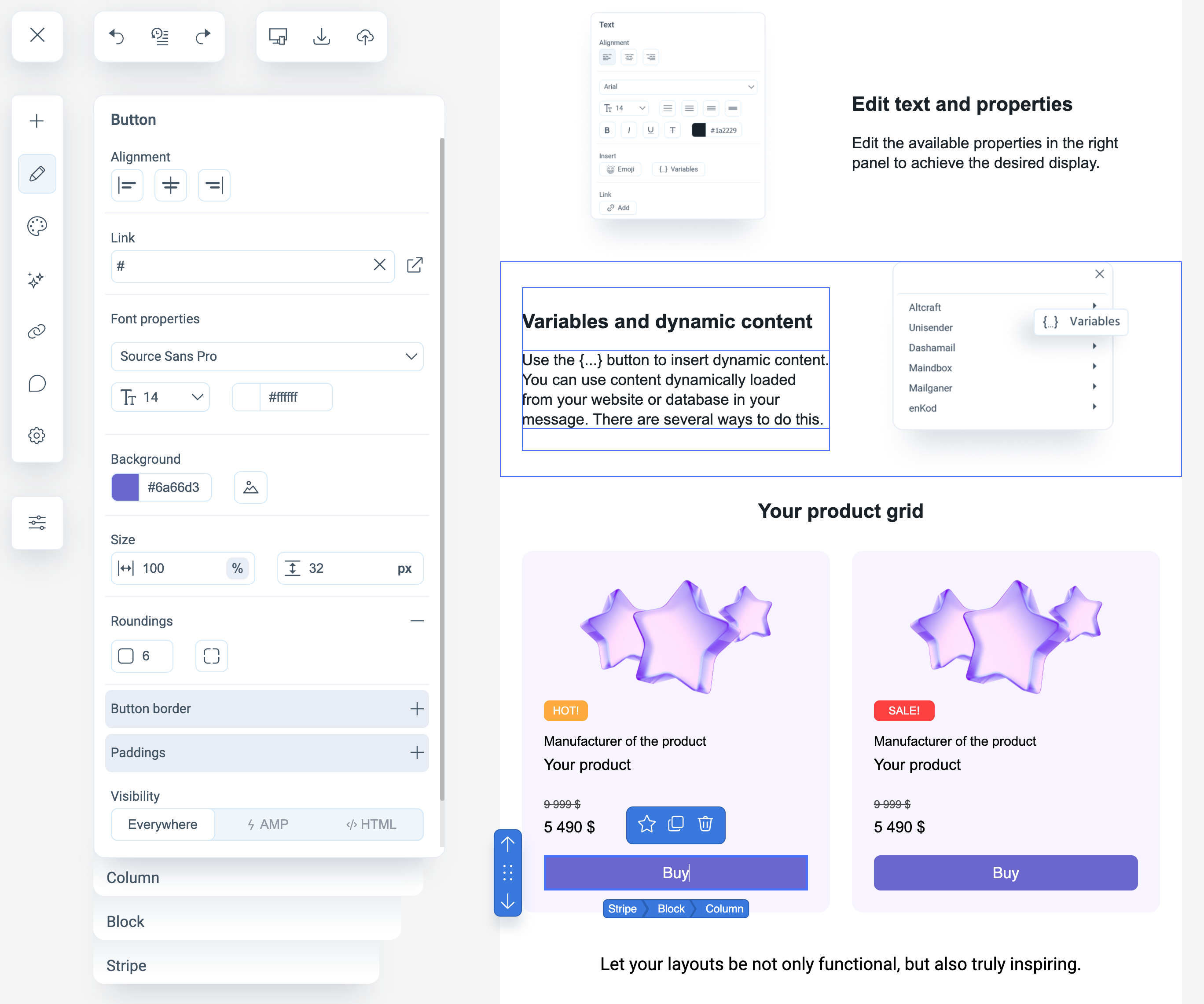 - Visibility — determines block visibility in different versions (HTML/AMP/everywhere, desktop/mobile).