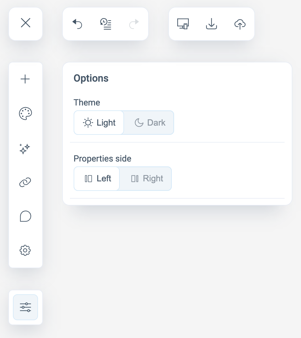 - Property panel position — defines where the properties panel appears. You can place it on the left or on the right, depending on your preference.