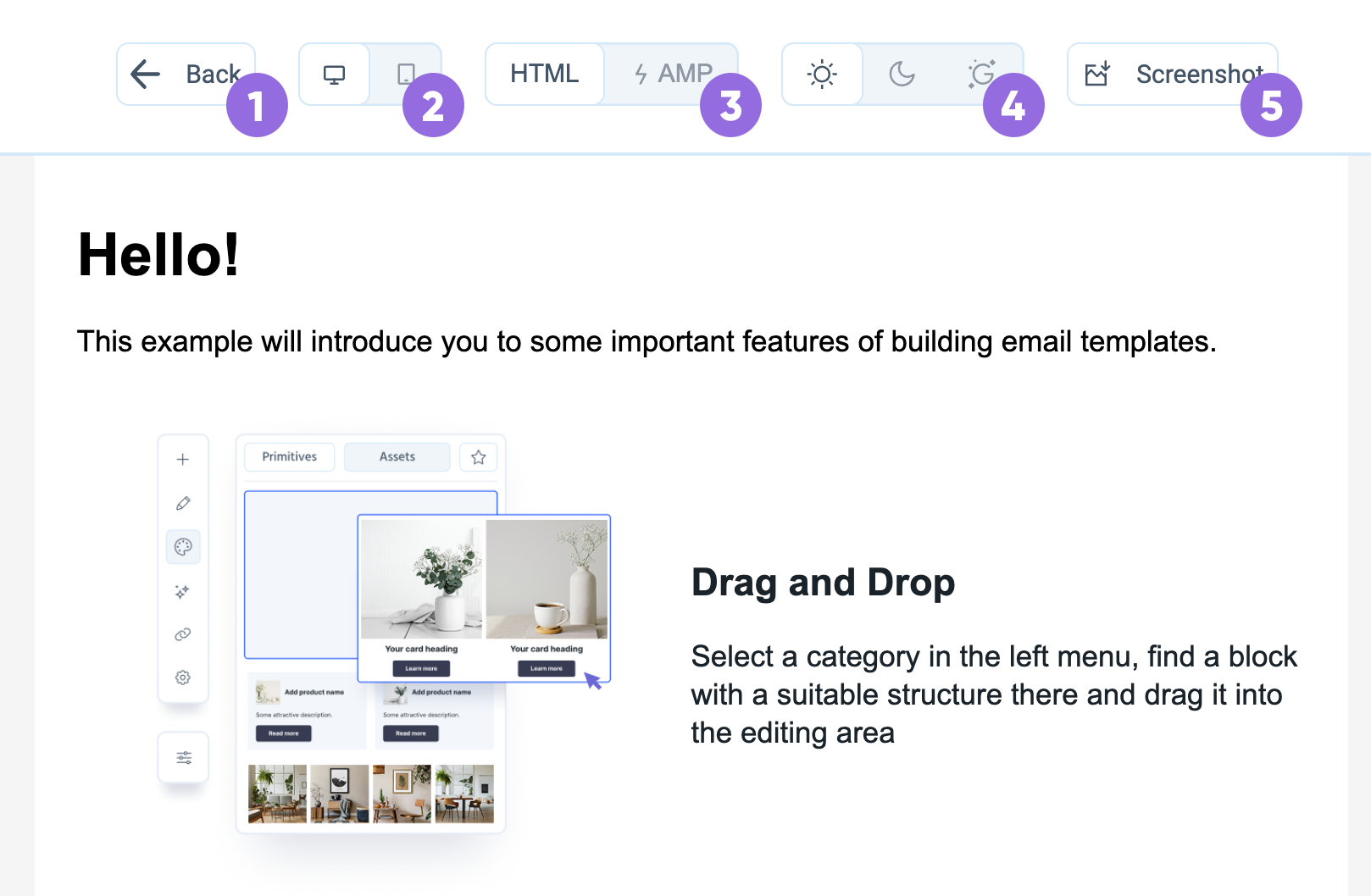 In the top panel of the workspace, click the Preview button. A window will open where you can see the finished letter, check how it looks in the mobile version and in dark mode.