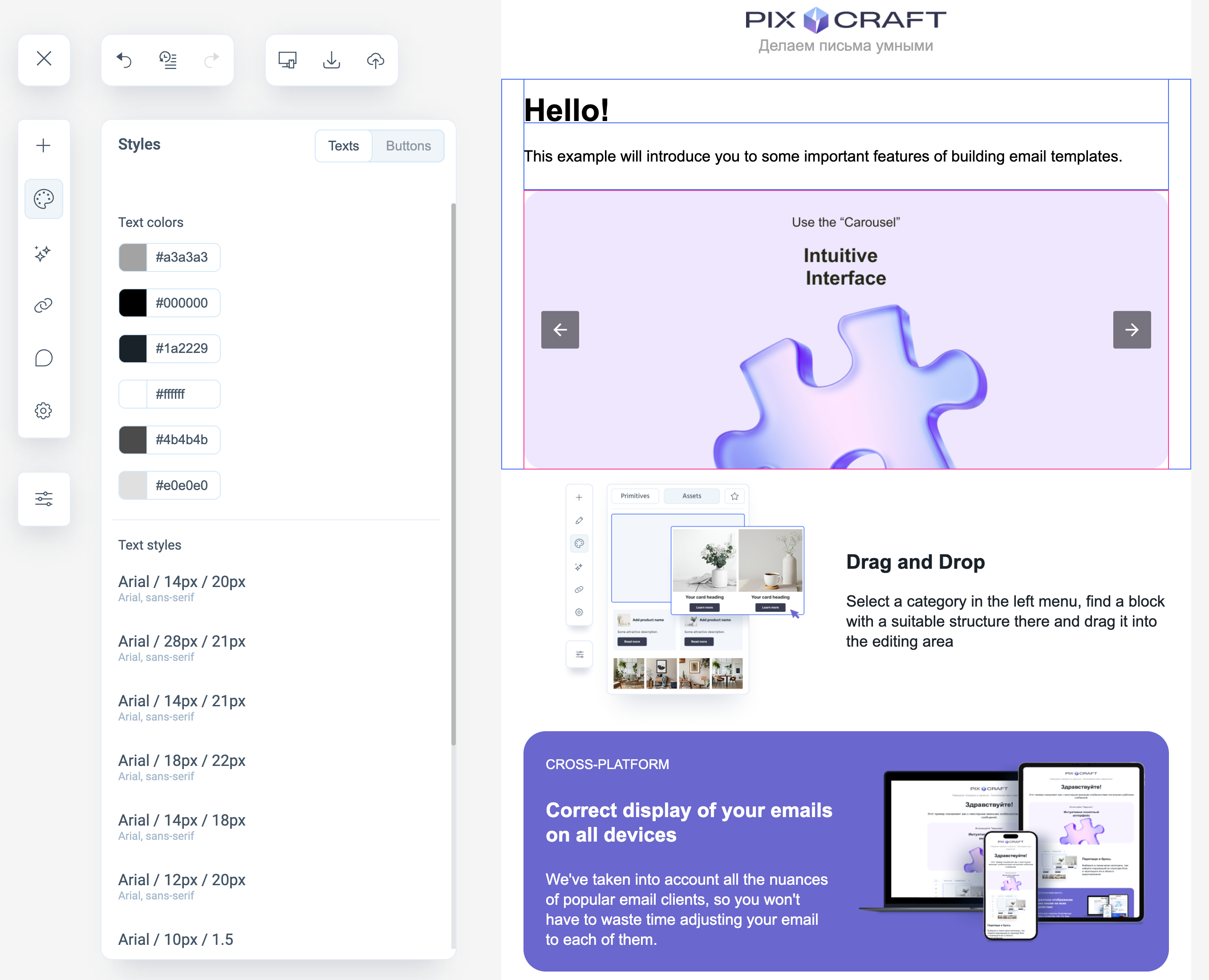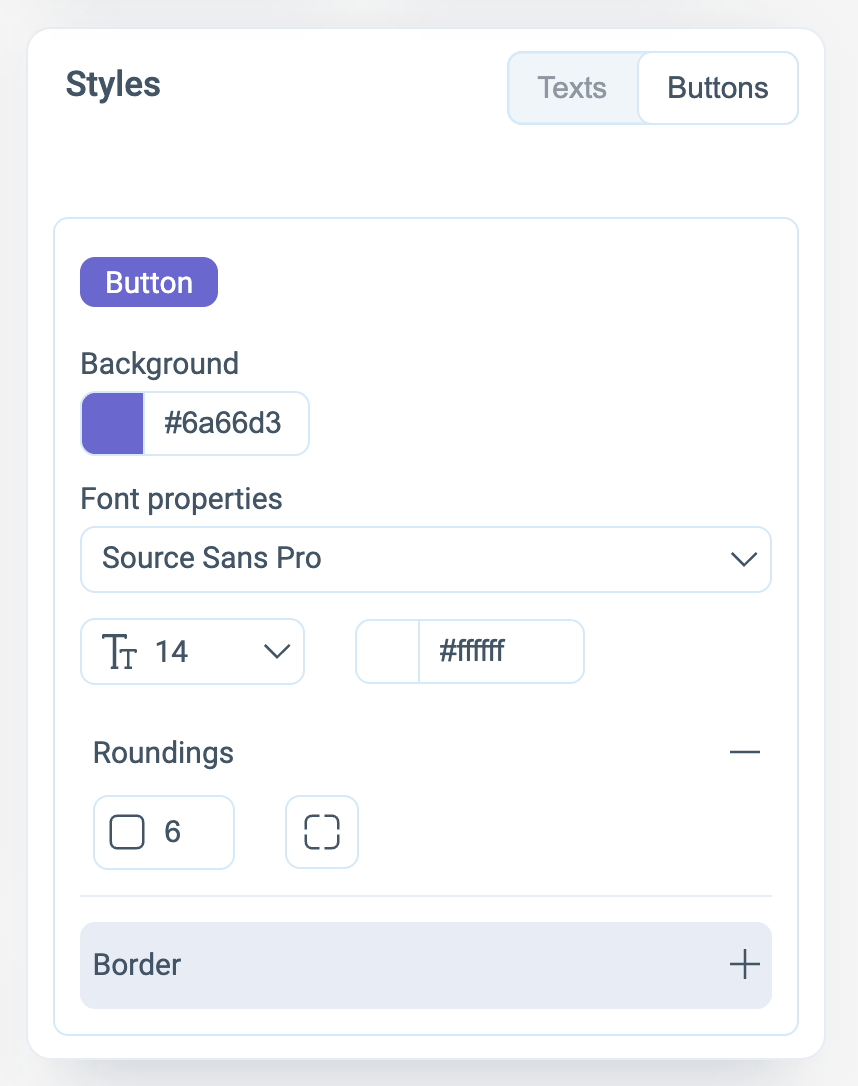 To maintain visual consistency and follow a unified design system, use the "Styles" section. Here you can monitor the colors and text styles used within blocks and buttons.