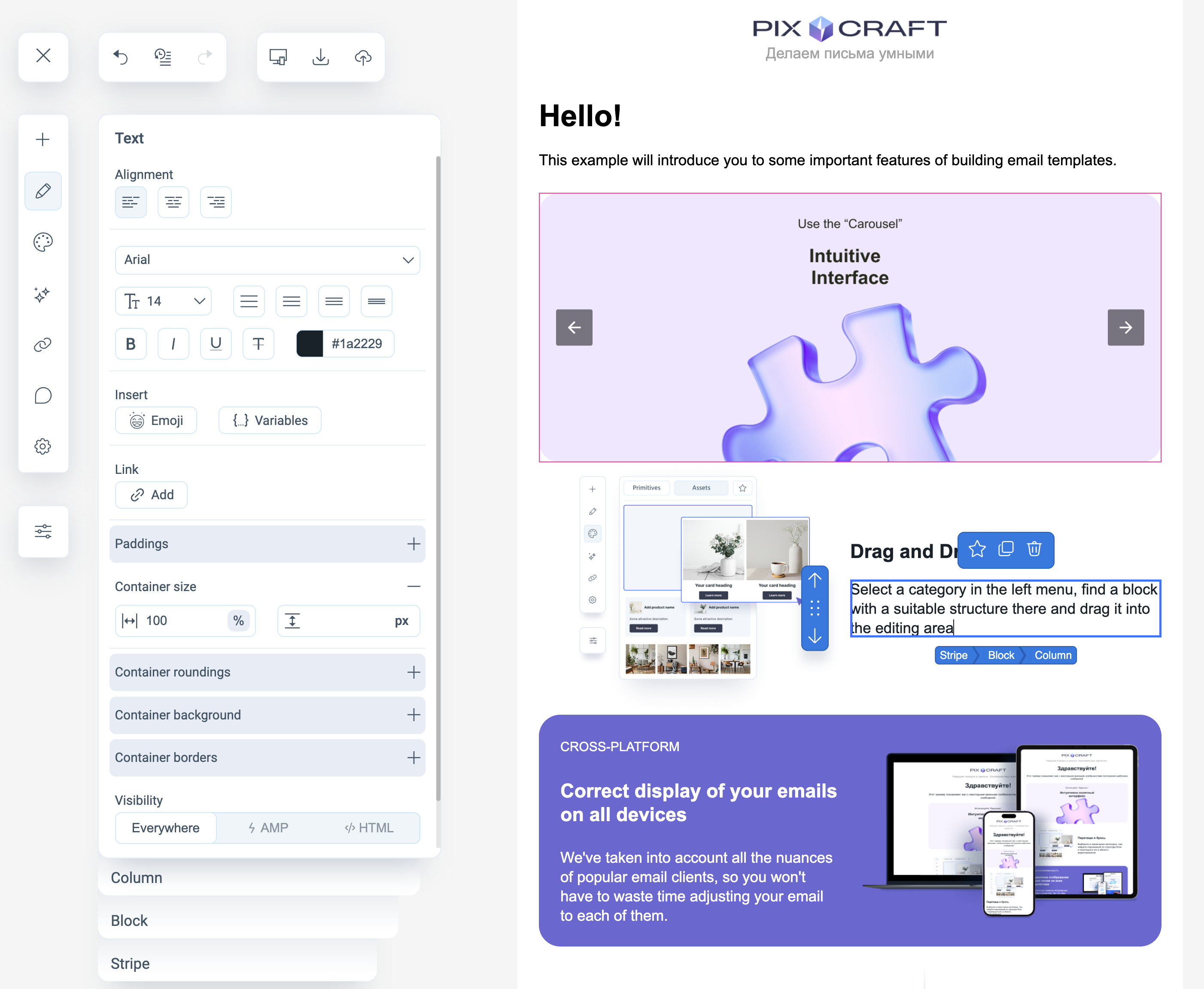 - Visibility — determines block visibility in different email versions (HTML/AMP/everywhere, desktop/mobile).