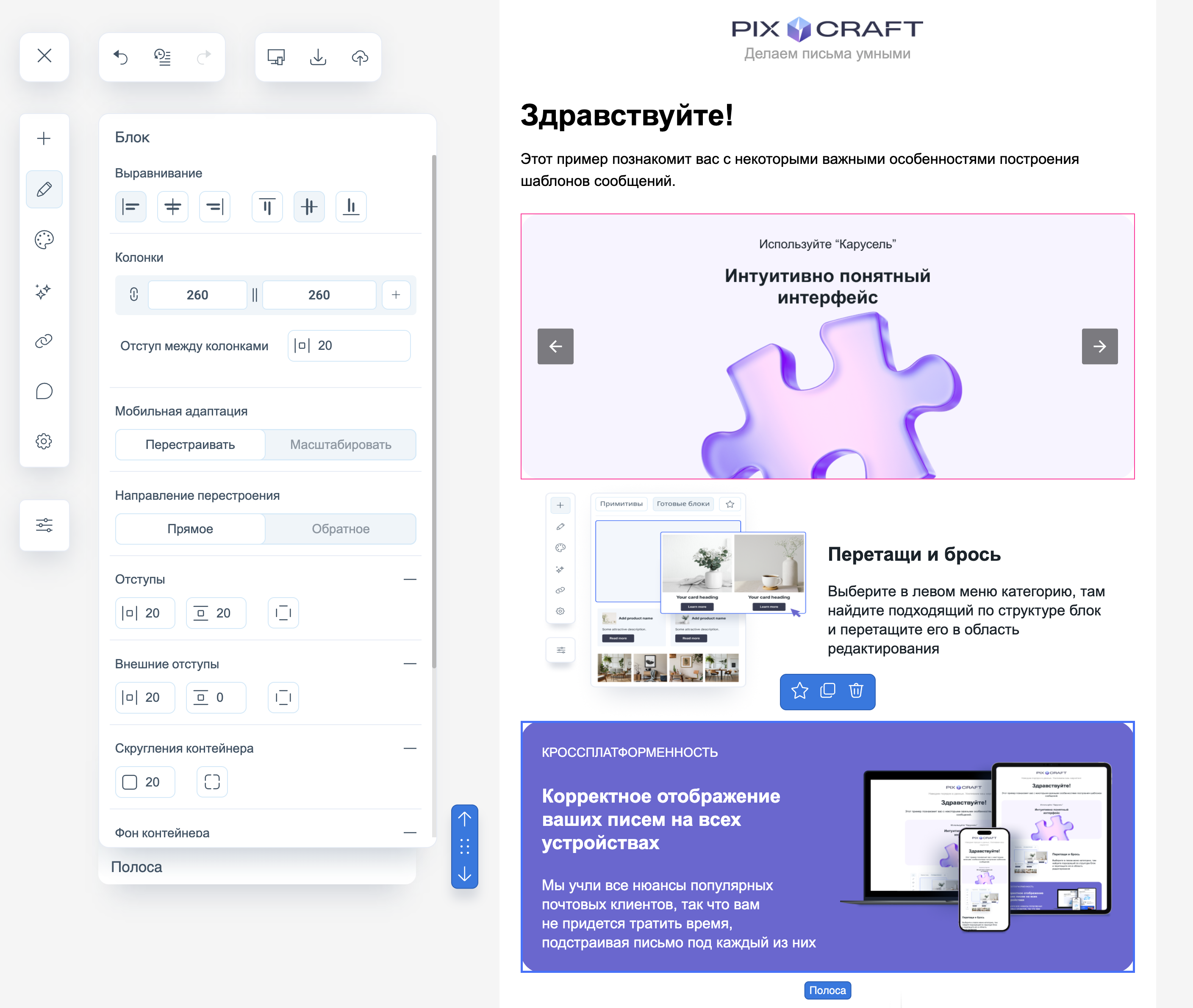 Отображение — определяет отображение блока в разных версиях письма (HTML/AMP/везде, десктоп/мобильное).