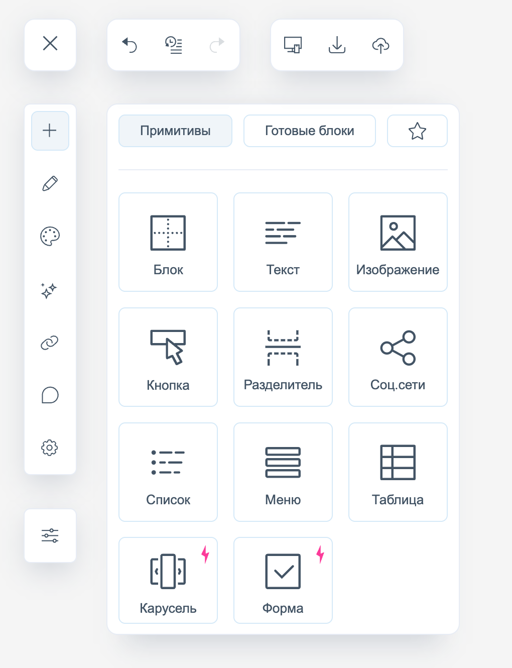 В этом разделе находятся все элементы, которые можно добавить в письмо. Они разделены на три категории: примитивы — структурные блоки без контента, готовые блоки — типовые заготовки, которые можно изменить по своему усмотрению, и избранные ассеты — сохраненные компоненты из этого или других писем.