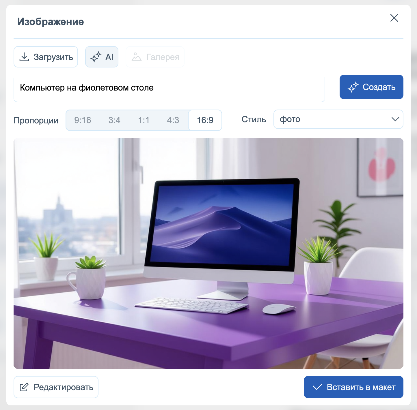 - Генерация изображения с помощью ИИ — Функция AI-генерации позволяет создать изображение прямо в редакторе. Опишите, что должно быть изображено, выберите стиль (фото, киберпанк, рисунок и т.д.), при желании уточните цветовую палитру и соотношение сторон.