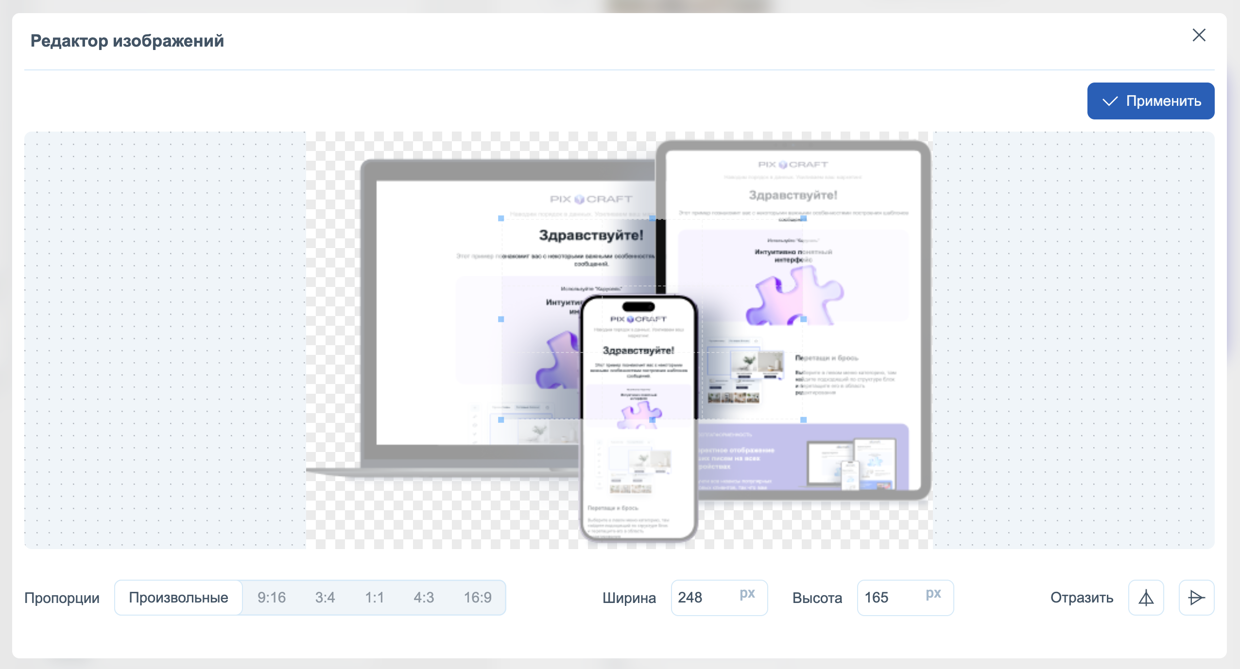 - Редактирование — встроенный редактор изображений позволяет обрезать изображение (crop), задать нужную область кадра вручную или выбрать один из шаблонов пропорций (1:1, 4:3, 16:9 и т.д.);