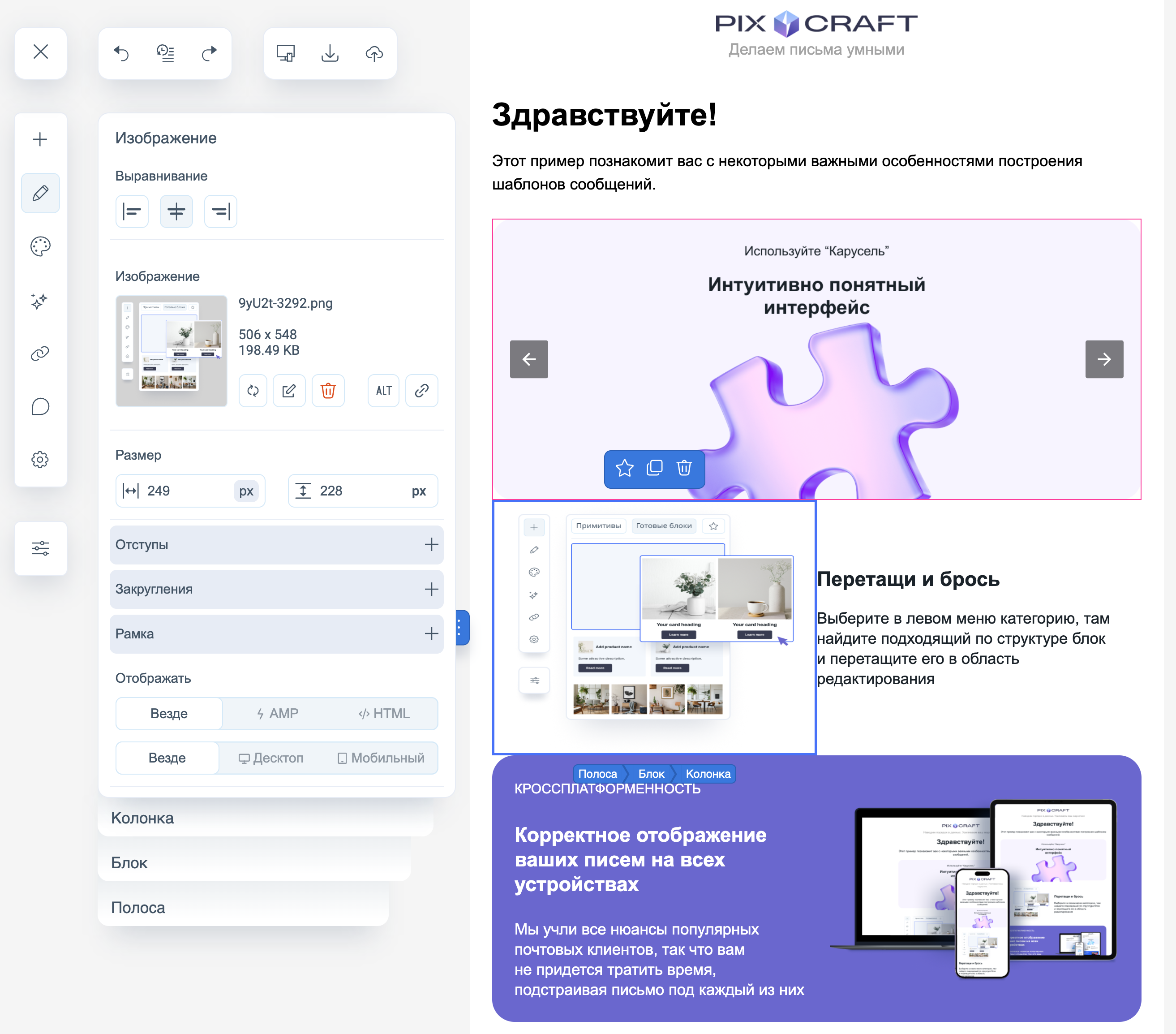 Отображение — определяет отображение блока в разных версиях письма (HTML/AMP/везде, десктоп/мобильное).