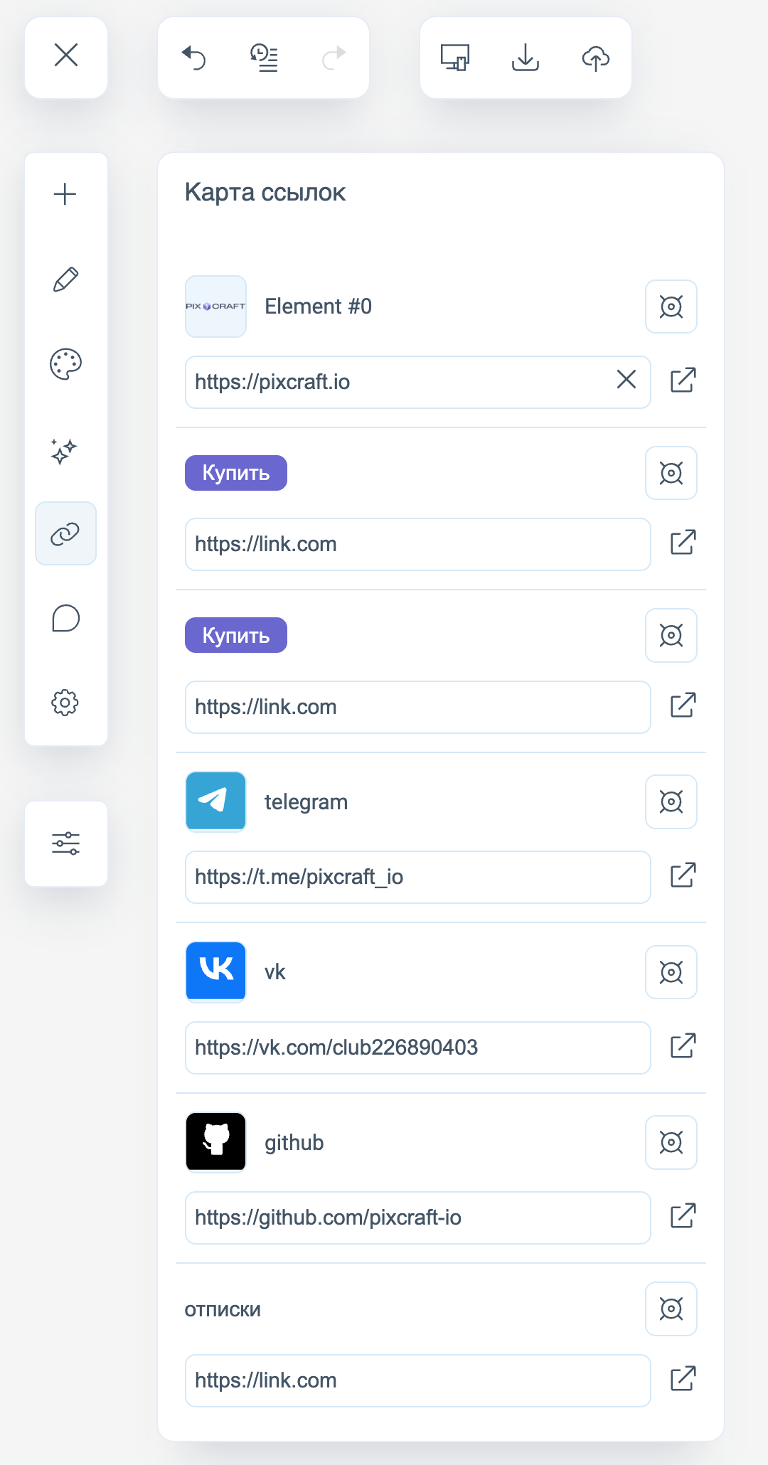 Удалить — удаляет ссылку из списка и из соответствующего элемента на холсте.