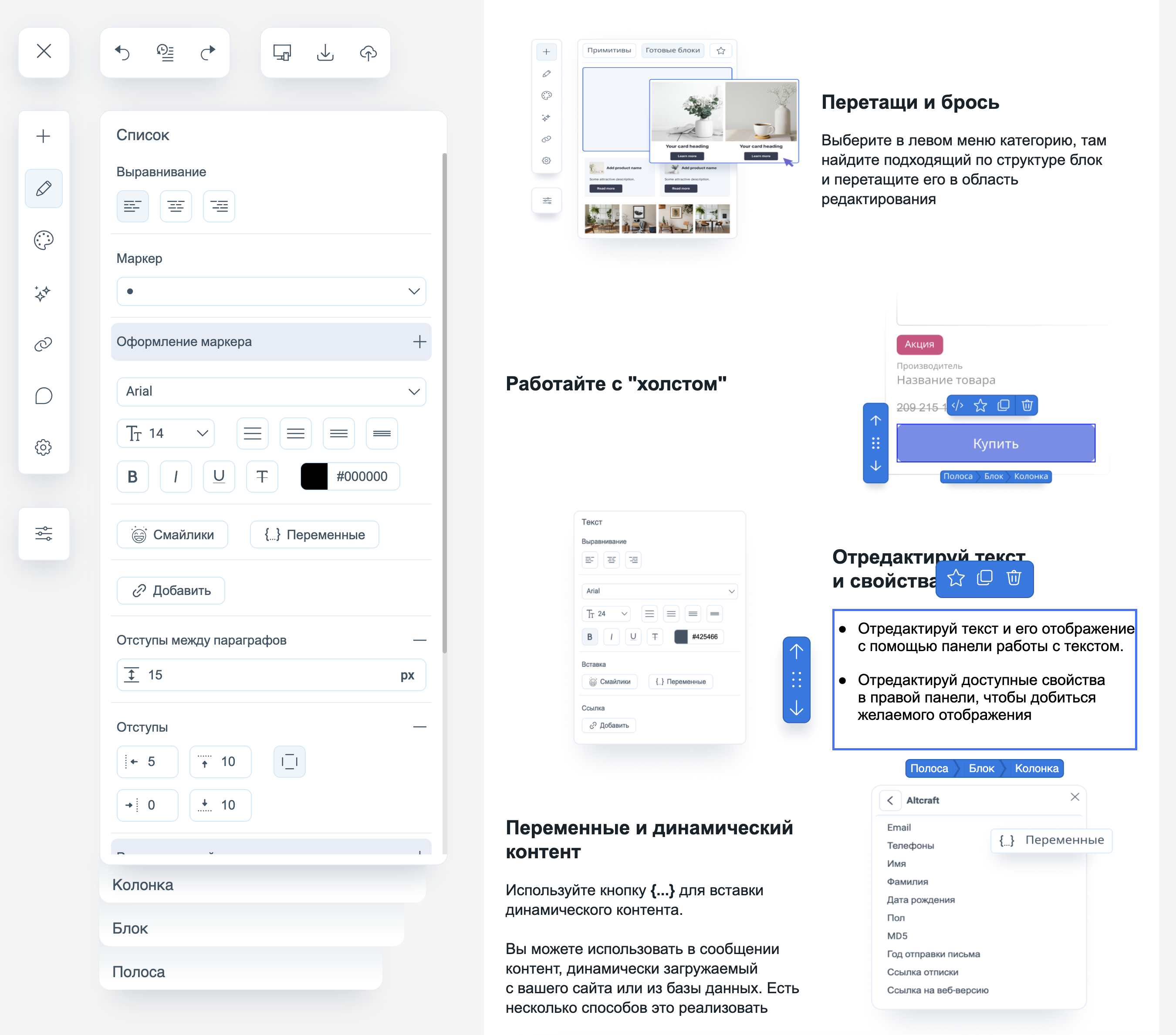 Свойства текста — размер, цвет, шрифт, стиль, а также вставка переменных и смайликов. Здесь же можно вставить ссылки в текст;