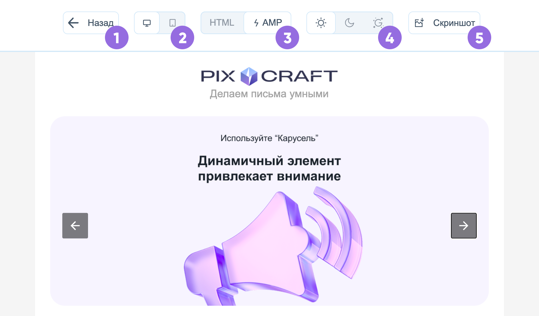 - Переключатель режима HTML/AMP (для интерактивных писем);